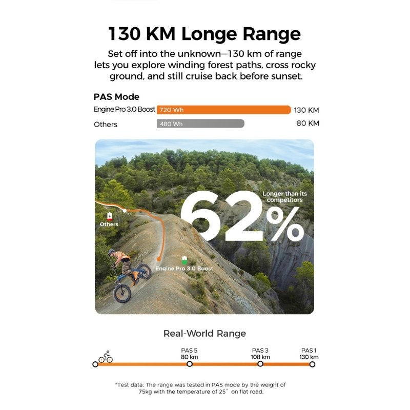 - Range: Up to 130 km / 80 miles Fully Charged in Pedal Assist Mode. Real-world range testing: PAS 1 – 130km / 80 miles, PAS 3 – 108km / 67 miles, PAS 5 – 80km / 50 miles *
