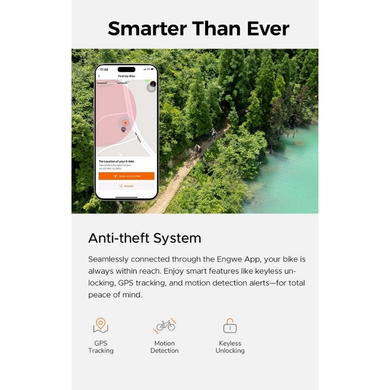 - Smart Phone App: ENGWE app control & Anti-Theft Function: GPS Tracking, Motion Detection, Keyless Unlocking